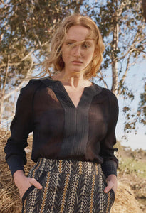 LUCENT CRINKLE COTTON SILK CONTRAST STITCH DETAIL CUFF AND NECKBAND BLOUSE