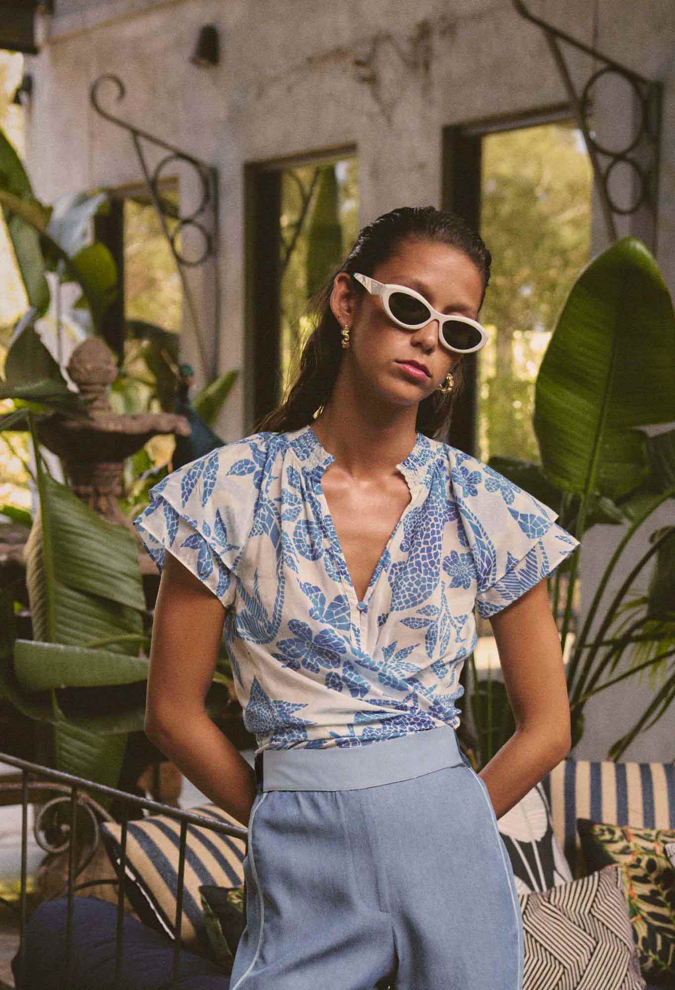 Elevate your everyday style with the Calandra Silk Cotton Flutter Sleeve Top in Azure Mosaic. Crafted from a luxurious blend of silk and cotton, this lightweight blouse offers the perfect balance of breathability, softness, and a subtle lustrous finish. The striking Azure Mosaic print brings a fresh pop of colour to your wardrobe, while the flutter sleeves add a feminine, romantic touch that moves effortlessly with you.